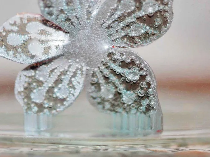 3. Жидкость для травления: в стеклянной баночке смешиваю перекись, лимонную кислоту и соль, заготовки кладу рисунком вниз. Самое начало — первые пузырьки