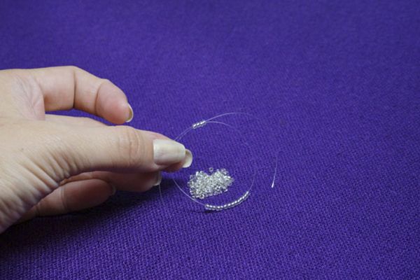 1. Отрезаем 10-15 см. лески. Нанизываем четыре маленькие бусинки, располагаем на середине.