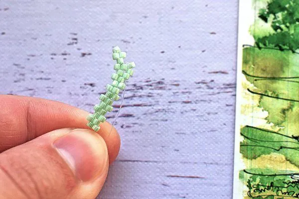 1. Приступим к заготовкам листочков. Листочки плетем в технике мозаичного плетения из светло-зеленого бисера.