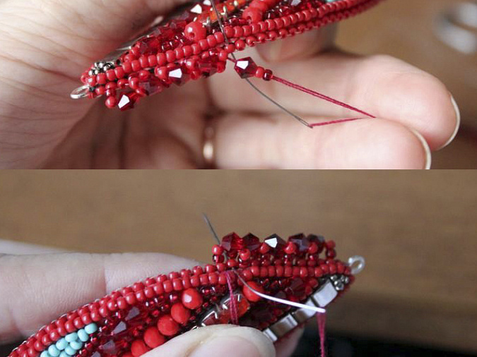 6. Для обработки края беру мононить. С изнанки ввожу иглу с нитью и кладу бисеринку отверстием вверх. Прохожу через отверстие иглой еще раз, затягиваю.