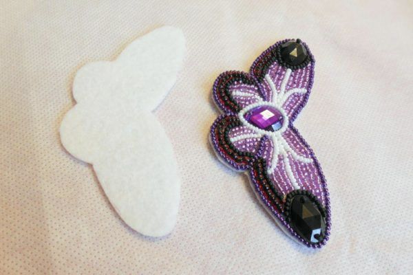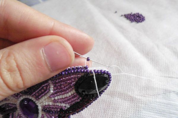 15. Пришиваем бабочку к спинке. Начинаем обрабатывать края вышивки бисером.