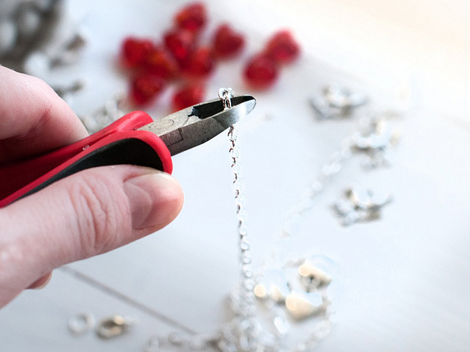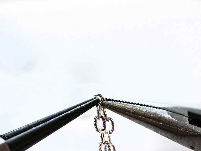 • 2. Сразу крепим замочек. С помощью плоскогубцев и круглогубцев аккуратно размыкаем звенья цепочки.