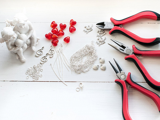 • 5. Теперь нужно сделать крепления для бусин-сердечек, чтобы мы могли прицепить их к цепочке. Для этого возьмем пин и, продев в бусинку, "откусим" лишнюю часть кусачками, отступив от отверстия бусины примерно 1,5 см.