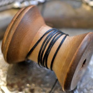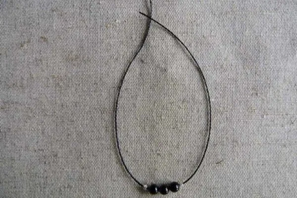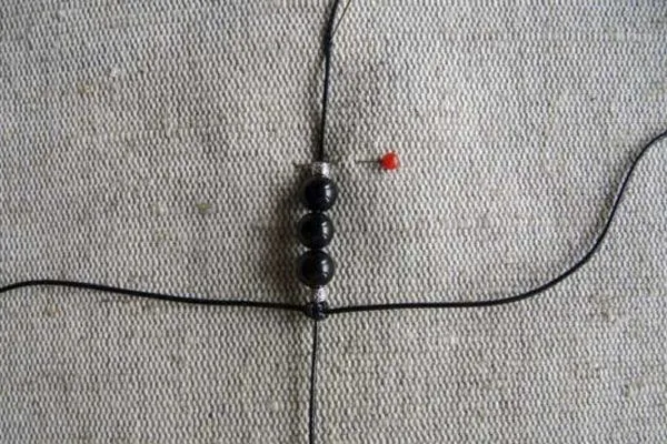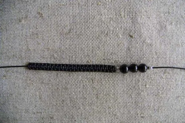 • 3. Берем основу браслета – нить 40 см, надеваем на нее 3 бусины из агата по центру и 2 металлические бусины с орнаментом по бокам. Помещаем все бусины на середину нити.