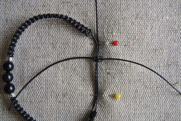 • 10. Закругляем браслет, как показано на фото, и плетем застежку из четырех квадратных узлов. Основой здесь служат обе нити браслета, рабочей нитью – отдельная нить 20 см.