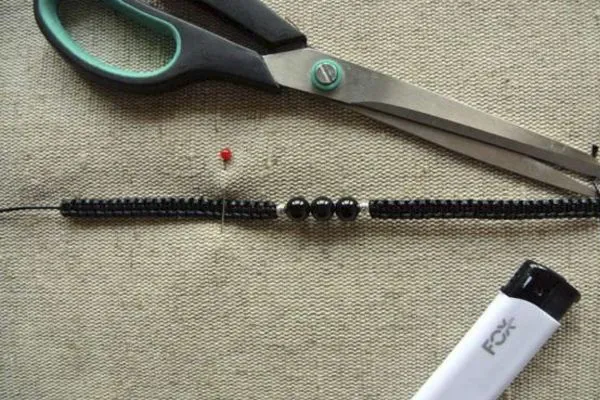 • 13. Оформляем концы браслета: надеваем металлические бусины-шарики, обрезаем излишки нитей, оставив 5-6 см, подпаливаем концы.