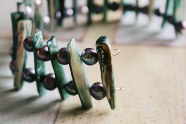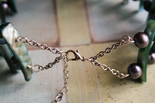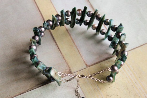 6. Используем нижнее (второе) отверстие перламутровых бусин. Мемори-проволка будет гнуться, это не страшно. Поэтому мы берем проволоку толщиной не более 0.7 мм, с более толстой проволокой мы не сможем сделать второй ряд. Доходим до конца и делаем петлю.