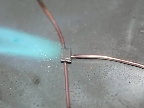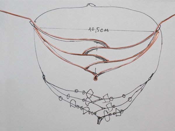 14. На середину отрезка тросика помещаем “ушко” колье, оба конца продеваю в кримп, кримп подтягиваю к “ушку” и зажимаю плоскогубцами.