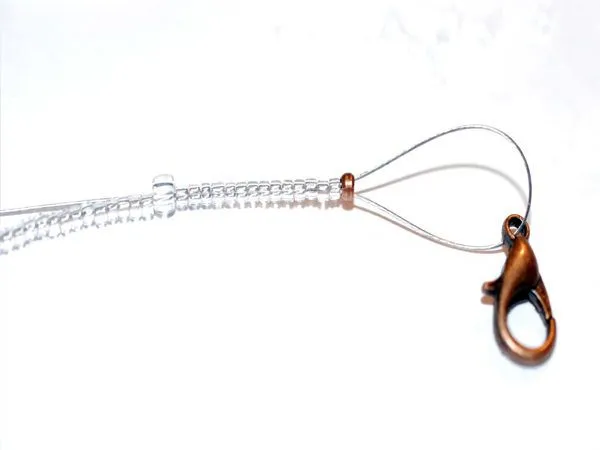 15. Теперь нанизываем бисер с маленькими бусинами, достигнув нужной длины нанизываю кримп, замочек и кончик тросика обратно в низку, тянем наружу после последней бусины – кончик удобней будет прятать именно в ней.
