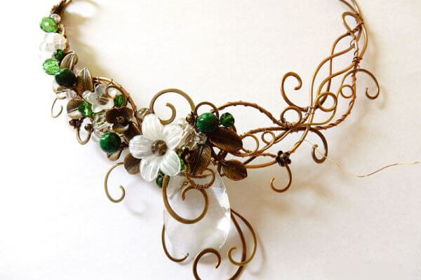 8. Теперь начинаем украшать изделие, прикручивая к основе обмоточной проволокой различные бусины, акриловые цветочки, металлические элементы и другой декор, который подскажет ваша фантазия