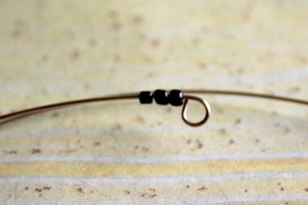 6. Доходим до мемори-проволоки и надеваем ещё одну бисеринку, в неё продеваем длинный хвост лески и снова набираем бисер, нужно вам количество, далее снова отправляем леску в обратном направлении.